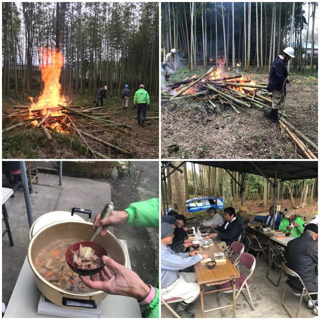 今回は、先日AS会員が平日に個別に伐採して頂いた第一竹林の焼却に4名、