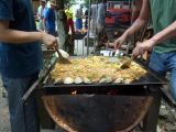 焼きそばの鉄板は本日がお披露目です。Nさんが寄付してくださいました。厚さが5,6ミリもある立派な鉄板です。おかげで焦げ付くこともなく美味しく仕上がりました。焼きそばの材料準備は事務局長とSさん、焼きはMさんご夫妻。手慣れた手つきで暑さをものともせずに焼いていました。