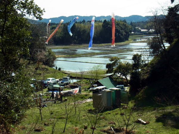 午後から昼食後の食器洗い作業、植樹したアンズをアミダくじで分配し、個人の名札をつける作業、鯉のぼりの撤収、そして傘亭の完成作業がありました。良い気候で気持ちの良い一日でした。