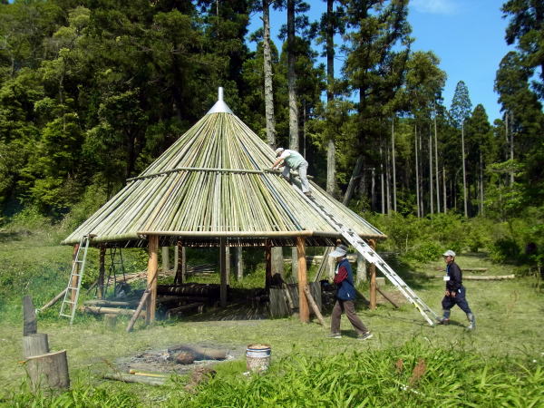 傘亭の作業も終盤を迎え、KYM氏を中心としてあーじゃない、こーじゃないと相談しながら楽しそうで、大人の工作教室の雰囲気です。チーム作業で進んでいますから「技術の後継」も心配なさそうです。E氏のお孫さんの小5のSくんもはしごに昇って竹竿の運び役に立ちました。コンピュータゲームより野外活動が好きだという少年になったらすばらしい。