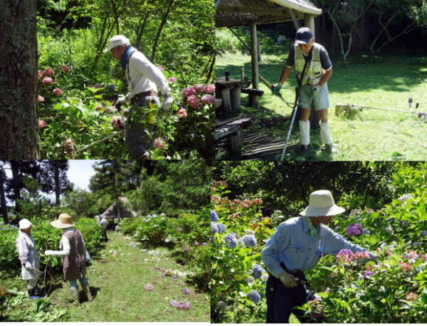 庭木の剪定に心得のある会員はバッサリと不要樹木を削除します。アジサイの剪定をしている人もいます。特技のない会員だってすごく役立ち、伸び放題のくずを根元から切断しています。