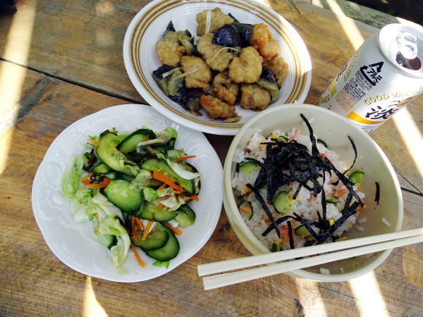 さて、首を長くして待っていた昼食はMuraご夫妻ご自慢の冷やし汁、しし唐や夏野菜の辛み味噌、鶏むね肉の南蛮味噌ゆで肉、キュウリ・ナスの浅漬け、それと差し入れのキュウリのQちゃん。まだあったかな、とても豪華です。鯵の干物をほぐして擦った冷やし汁は絶品で、麦みそ仕立てでした。氷が数片浮いていて、ほてった体に優しい。あっという間に完食でした。