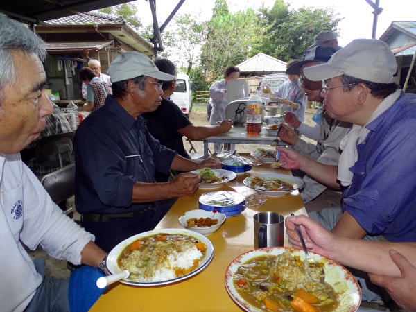 昼食は雨が降り出しそうな天気なので急遽、センターに戻って食事となりました。シェフはAさんで、特製カレーライス。肉は不平等にならぬようにひき肉。ひき肉も具材もたっぷりで量もたっぷりですから好きなだけよそって下さいとありがたいお言葉。当日の調理時間短縮のため、前もって飴色玉ねぎを大量に用意したそうです。高級トマトや隠し味に唐辛子。だからオイシカッタのですね。絶賛されていました。毎回、絶品の里山昼食を食べてしまうと来月の食事担当は?の問いに手を挙げづらくなりますが、塩と砂糖を間違えても(たぶん)文句は言いませんから、「しょうがない、一肌脱ぐか」とチャレンジしてくれるようにお願いいたします。