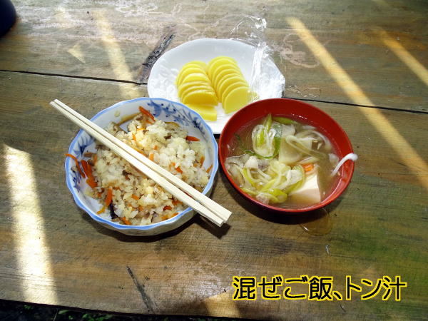 さて待ち焦がれた昼食はMIYOちゃんの混ぜご飯とトン汁です。毎回担当者が変わるのは良い方法でした。毎月、異なった味のご馳走が300円で食べられます。でも担当者の準備は大変です。今回は二品に必要な具材は、合い挽き肉・豚バラ肉・ニンジン・ゴボウ・シイタケ・シメジ・油揚・豆腐・ナガネギ、そして大量の里芋はFさんの差し入れ。